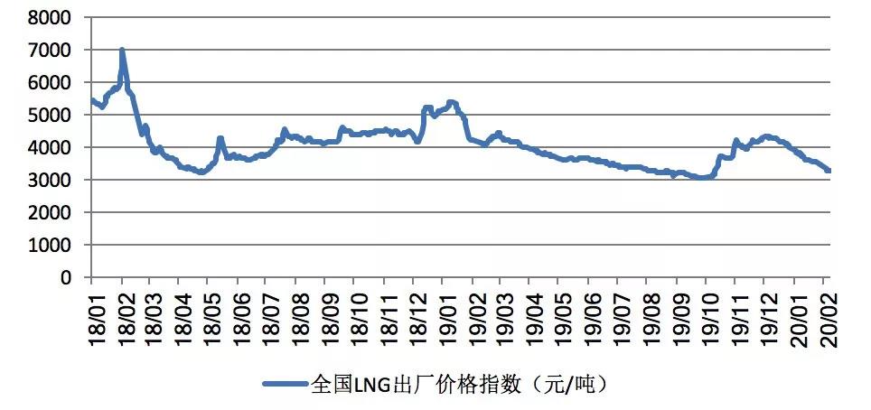 國內(nèi)LNG需求的低迷導(dǎo)致其價格也承壓下行。根據(jù)上海石油天然氣交易中心發(fā)布的全國LNG出廠價格指數(shù)測算,2月7日,全國LNG出廠價為3277元/噸,與去年同期高于4000元/噸的價格水平下跌18%,較2019年12月31日的3929元/噸的價格水平下跌652元/噸,跌幅為16.6%。