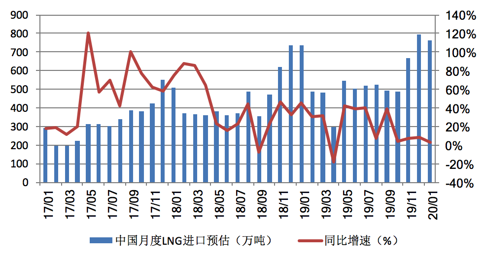 新華能源E-gas數(shù)據(jù)平臺的預(yù)測結(jié)果顯示,2020年1月份,中國LNG進口量預(yù)計為763萬噸,較去年同期增長3.4%,較2019年12月減少3.9%。