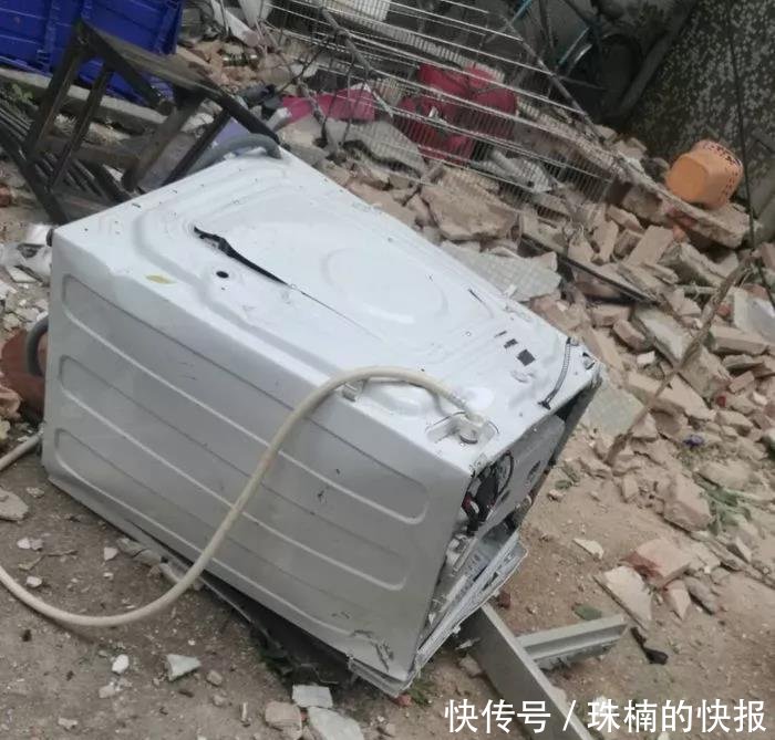 事發(fā)地點位于桃園小區(qū)34棟3梯2樓。記者在現場看到,2樓住宅西面及南面的墻壁被震塌,倒下的墻體砸中樓下一部小車。二樓門框和洗衣機等家具也掉到樓下,磚塊瓦礫、玻璃碎片灑落一地,現場一片狼藉,可見當時爆炸的威力十分巨大。