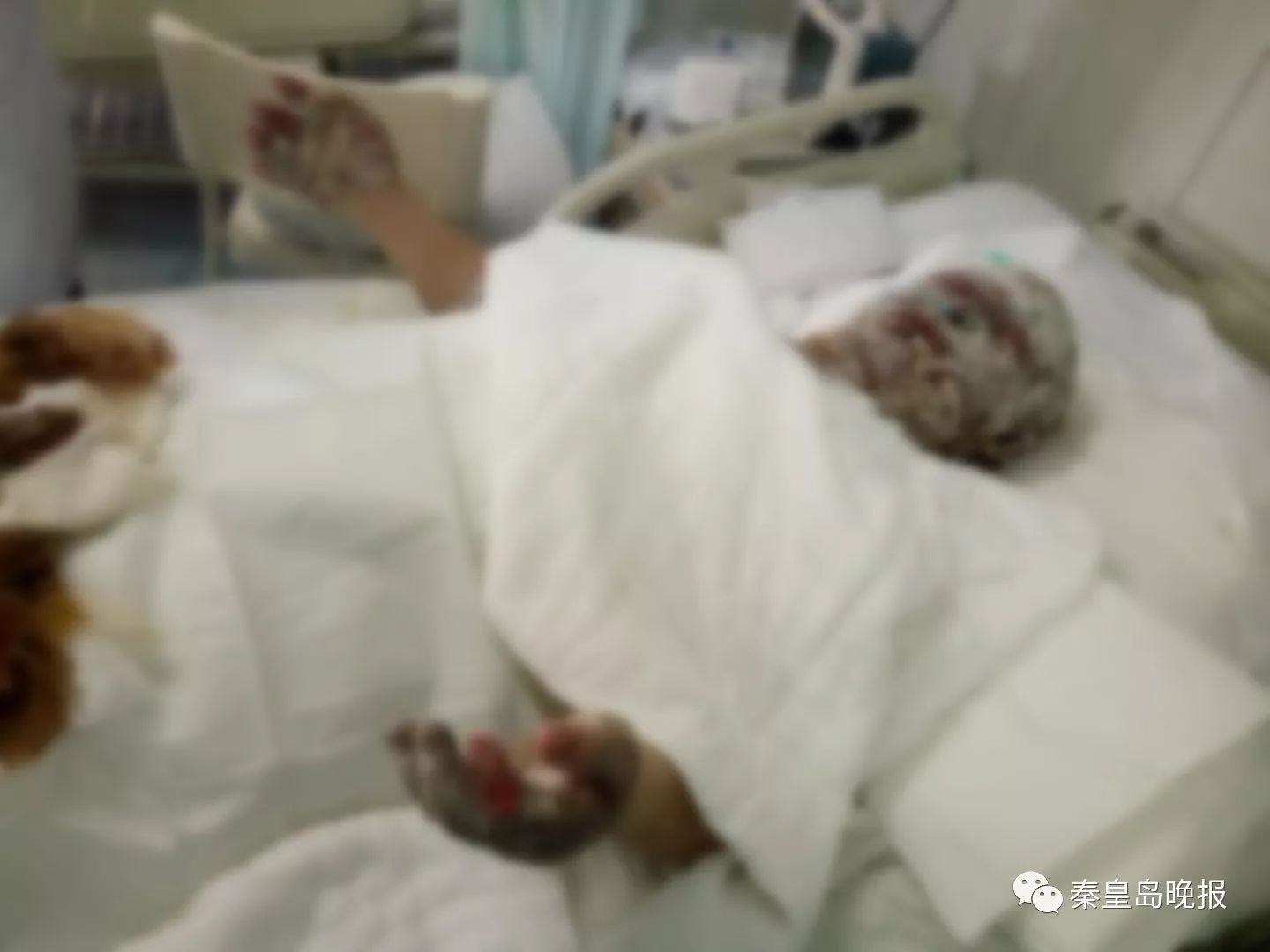 在這間潔凈、有著精密治療儀器的病房里,李偉鵬父母的病床是相鄰的4床和5床,中間只隔著1條1米多寬的通道。愛(ài)漂亮的母親沒(méi)了滿(mǎn)頭秀發(fā),臉上布滿(mǎn)燒傷痕跡,裸露在外的皮膚都纏裹著厚厚的紗布。曾經(jīng)意氣風(fēng)發(fā)的父親五官腫脹變形,眼睛腫成一道縫。
