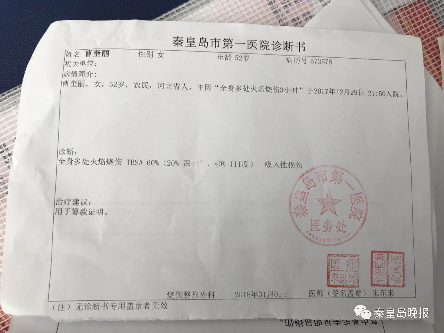 2017年12月29日,李偉鵬最不愿意回憶的一天——父母在青龍滿(mǎn)族自治縣龍王廟鄉(xiāng)經(jīng)營(yíng)的小餐館煤氣罐泄漏爆炸引發(fā)火災(zāi),在火海中掙扎的父母被鄰居救出送往醫(yī)院,全身大面積燒傷,傷情更為嚴(yán)重的母親燒傷面積達(dá)60%。