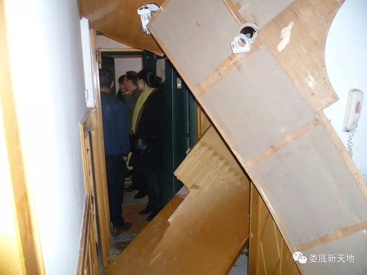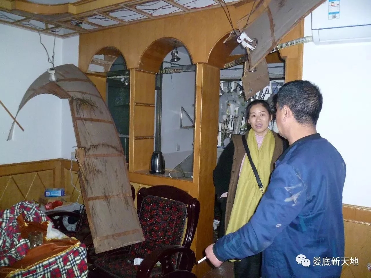 下午6時,筆者走進(jìn)這套位于仙人閣的三室兩廳居室。只見防盜門活脫脫地被強(qiáng)大的氣浪沖開,里層的木門碎裂倒掉,客廳的天花板上也有好幾塊被毀。三個臥室、陽臺、廚房的玻璃全部被震碎,碎玻璃撒了一地,滿地狼藉。臥室的柜子也被沖倒。
